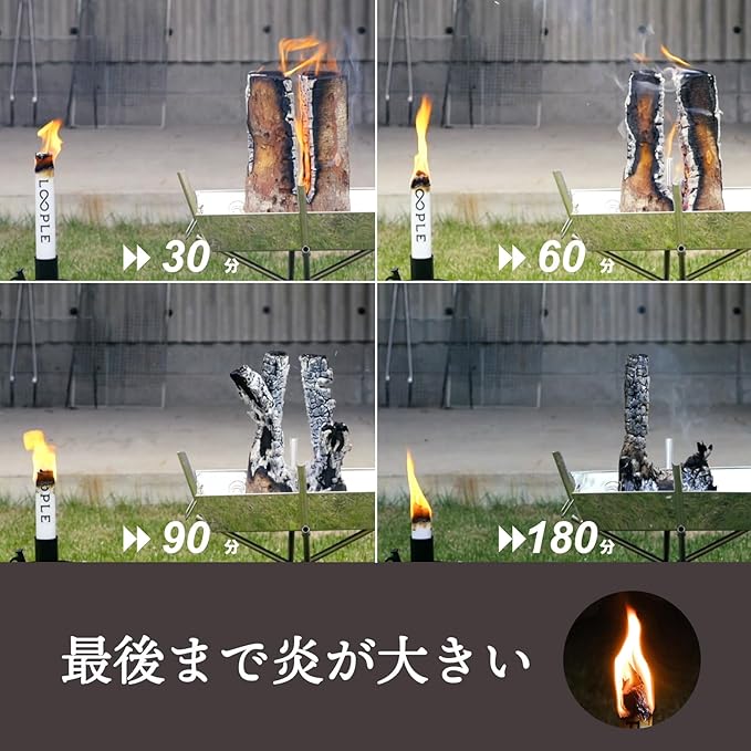 焚火と異なり、灰が飛ばず、嫌な臭いもありません。そのため、家の庭など、焚火が難しい場所でも使用できます。長時間燃焼しても、炎の大きさが変わりません。燃焼を始めてから燃え終わるまで、しっかり大きな炎を楽しめます。