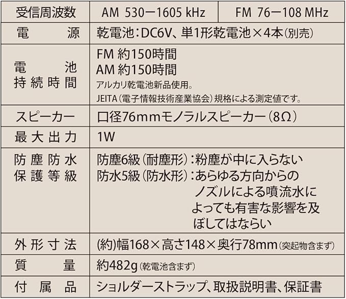 【 仕 様 】 ◆受信周波数:AM…530-1605kHz、FM…76-108MHz ◆電源:乾電池…DC6V 単1形乾電池 4本(別売) ◆電池持続時間:FM受信/約150時間、AM受信/約150時間(アルカリ乾電池新品使用) ◆スピーカー:口径76mmモノラルスピーカー(8Ω)