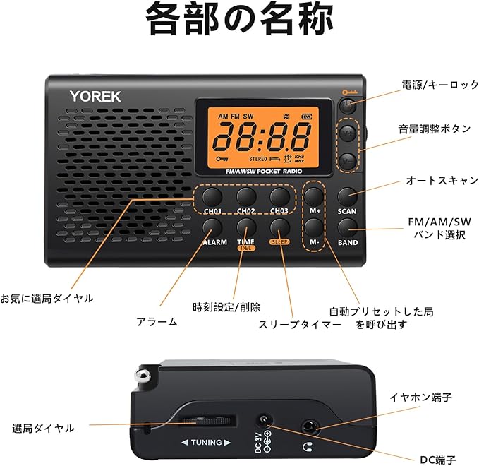 自動選局&お気に入り局:本機はオートスキャン機能を搭載しております、お使いの地域で受信可能な放送局を一括してメモリー登録できます。FM/AM/SW各バンドで35局保存できます。また、FM/AM/SW各バンドについてお気に入り局を3局保存できます、ワンタッチで保存したお気に入り局を呼び出しできます。日常使用にとても便利です。選局ダイヤルも付きます、回すだけで簡単にご選局もできます。