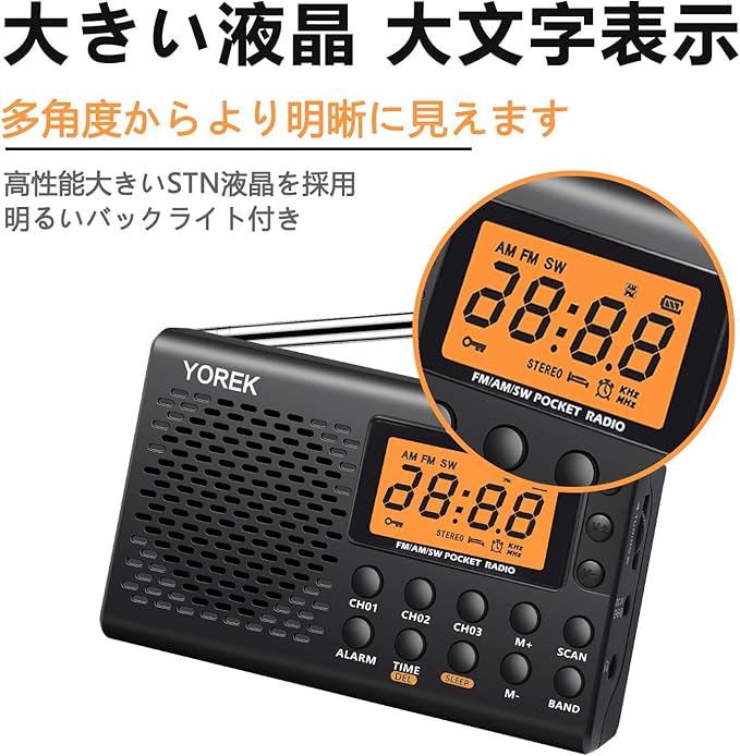 高感度受信&大文字表示:高性能DSPデジタルチューナー搭載のFM/AM/SW3バンド小型ポータブルラジオです。360度回転FM/AMロッドアンテナとAMアンテナを搭載しております、抜群な受信感度を実現できます。大きいSTN液晶を採用、明るいバックライト付き、大文字表示、多角度からより明晰に見えます。