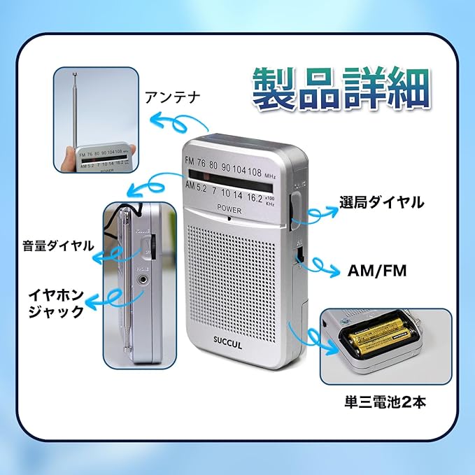 【製品特徴】操作はアナログで簡単にできます。ワイドFM(FM補完放送)対応、イヤホンでもスピーカーでも聴けます(イヤホン別売)、FMロッドアンテナ付き、モノラル受信、本体カラーはシルバー。