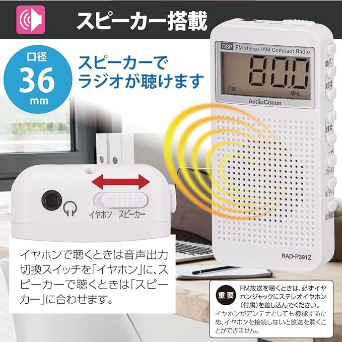 【 特 長 】 ◆デジタルチューナーのクリアな音声 デジタル変換処理で混線しにくく、クリアで雑音が少ない ◆ATS(自動選局→登録)で選局も楽々 選局時に感度の良い放送局を自動で選局、AM/FM各40局まで登録 ◆ワイドFM(FM補完放送)対応
