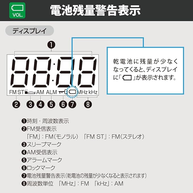 ● 電池残量警告表示、音量表示付き
