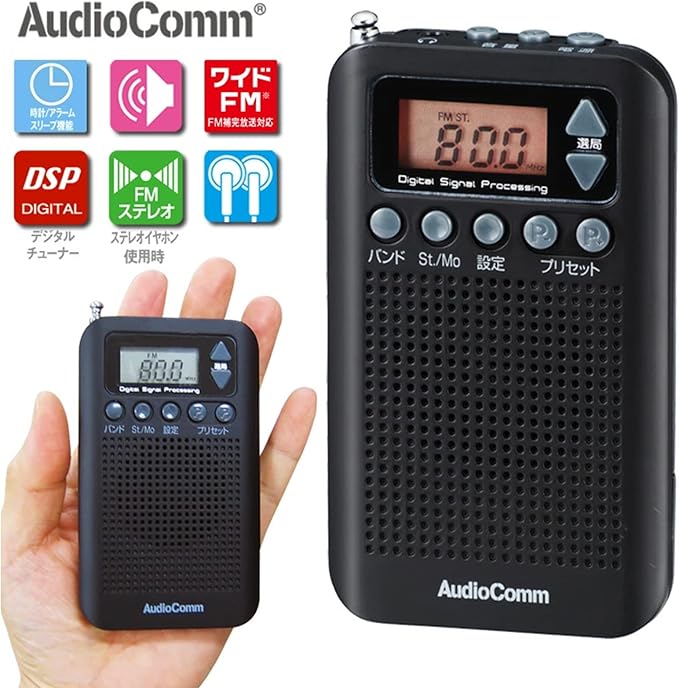 音量もデジタル表示 AM/FM各20局を自動でメモリーできる自動選局&保存機能付 時計・アラーム・スリープ機能付 ワイドFM対応 FMロッドアンテナ付 誤作動防止ロック機能付 スピーカー搭載・ステレオイヤホン付属