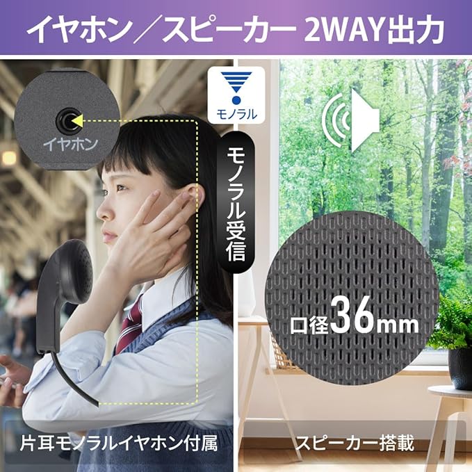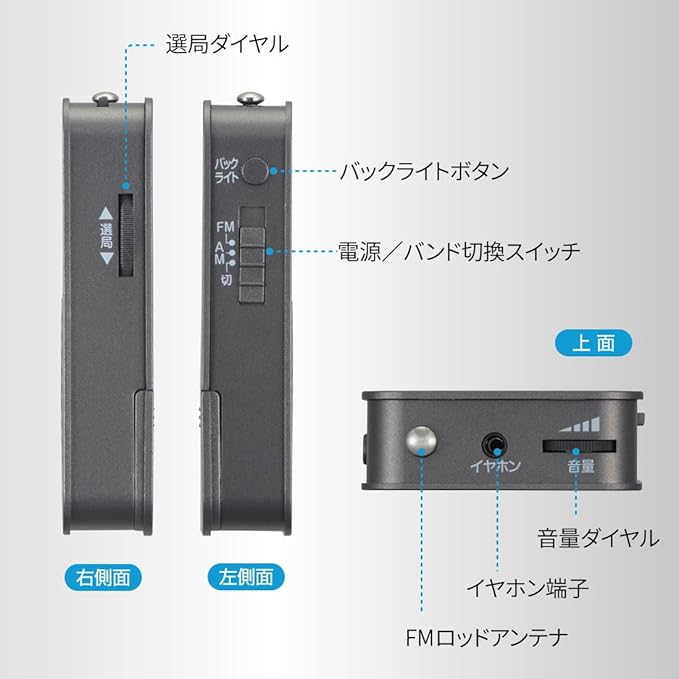 【 特 長 】 ◆大きくて見やすいデジタル表示、ダイヤル選局式 ◆バックライト付き液晶表示で、暗い場所でもらくらく選局 ◆モノラル受信 ◆イヤホン/スピーカー2WAY出力 ◆片耳モノラルイヤホン付属 ◆360 回転式FMロッドアンテナ ◆ワイドFM(FM補完放送)対応