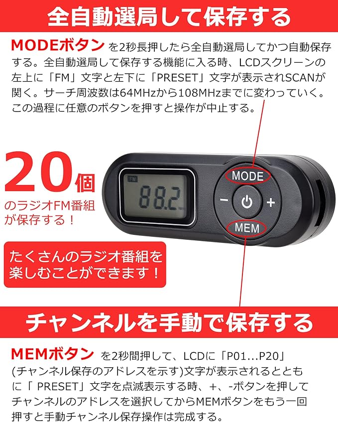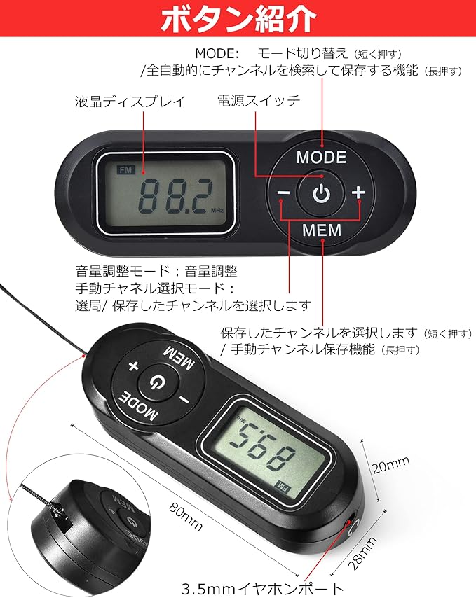 【メモリーラジオ】抜群なチップを採用し、20個のラジオFM番組が保存でき、たくさんのラジオ番組を楽しむことができます!更に電源オフメモリー機能を備えており、次回からの使用はもっと便利に操作可能です。保存されたラジオ放送局は、シャットダウンまたはバッテリの交換のために失われません。