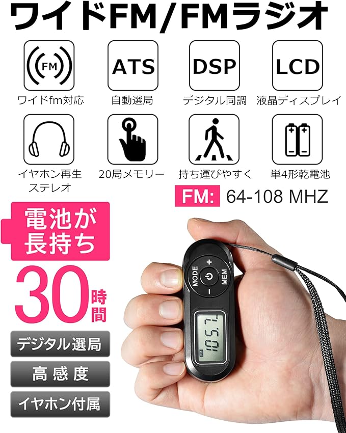 【高感度ラジオ】DSP(デジタル受信)でクリアな音声、DSP FMステレオポケットラジオ。災害時に強いAMラジオ番組がFM放送で聴けるワイドFM(FM補完放送)対応。対応周波数:64-108 Mhz、DSPデジタルチューナー技術とソフトウェアプログラミングを採用し、無線放送機能を実現します。