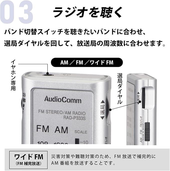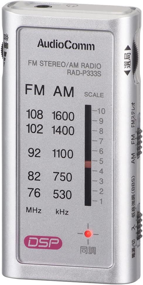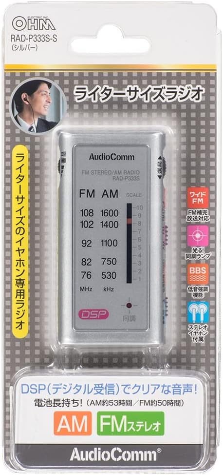 【 特 長 】● ライターサイズのイヤホン専用ラジオ● DSP(デジタル受信)でクリアな音声● 電池長持ち(AM約53時間/FM約50時間)● ワイドFM(FM補完放送)対応● 光る同調ランプ● 低音強調機能● ステレオイヤホン(FMアンテナ兼用コード)付属● 本体カラーはシルバーです【 仕 様 】■ 受信周波数:AM…530~1605kHz、FM…76~108MHz■ 電源:DC3V 単4形乾電池 2本(別売)■ 乾電池持続時間(アルカリ乾電池新品使用):AM受信…約53時間、FM受信…約50時間■ 外形寸法:幅41 高さ82 奥行17mm(突起物含まず)■ 質量:約40g(乾電池含まず)■ 付属品:ステレオイヤホン、保証書付取扱説明書