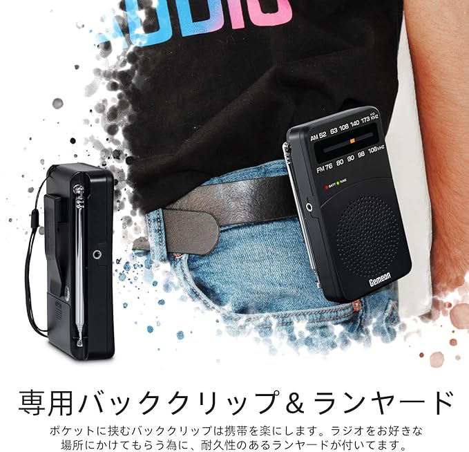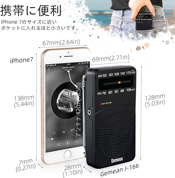 ポータブルデザイン:小さいコンパクトラジオ(69 120 30 mm)、iPhone 7のサイズに近く、重さたった119g(バッテリーなしで)です。さらに重要なのは、バッククリップとランヤードのおかげで、J - 166はポケットにクリップしたりして、持ち歩くのはかなり簡単です。朝練や散歩、公園で休憩したりするときに、このJ - 166ラジオでソフトミュージックや番組を楽しむのは素晴らしいことです。