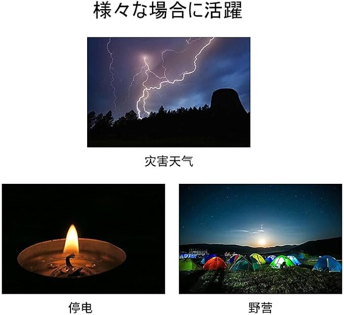 【懐中電灯として】 このソーラーラジオは3つのLEDライト付いています。災害時、停電しても、家族と一緒に屋外を明るくすることができます。キャンプ旅行時、夜間で防犯灯として安全を守ります。IPX 3 防水レベルで、日常防水要件を満たしています。飛来粒子や小雨からラジオを守ります。ご注意:水に浸かったり、雨に濡れたりすることはできません!