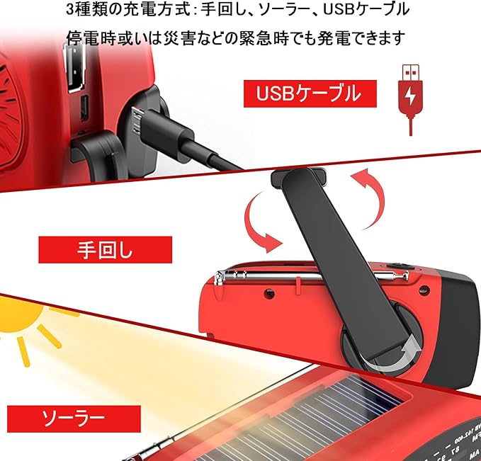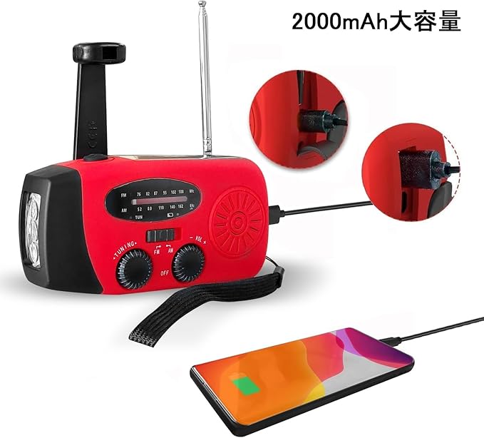 【3WAY充電】 USB・ソーラー・手回しで充電可能!防災用品ではあってはならない「使いたいのに電源がない」事態を防ぐことができます。通常のUSB充電またはソーラー充電できます。太陽の下に置かれている限り充電できます。災害時などの緊急時には、背面のハンドルを回して充電することができます。また、2000mahの大容量バッテリーを内蔵しており、災害などの緊急ライトとして使用できます。フル充電するとラジオは 20 ~ 22 時間、懐中電灯は 10 ~ 12 時間使用できます。