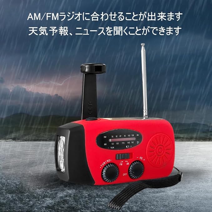 【アウトドアシーン適用】 IPX3レベルの防水加工を施しているので、激しい雨でも安心です。 IPX3は防雨・防水仕様となっておりますので、水没させないでください。また、コンパクトなサイズなので置き場所を選びません。防災ラジオは家に一台あっても損はありません。重さは210gと非常に軽く、持ち運びも簡単です。ラジオにはストラップも付属しており、キャンプやハイキングのときにバックパックに掛けることができ、非常に便利です。