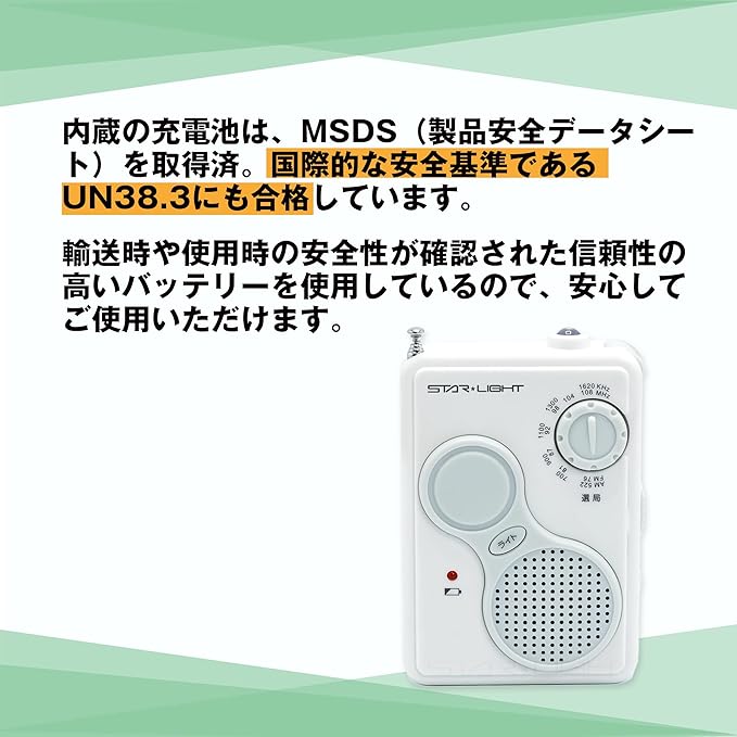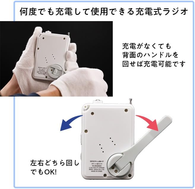 コンパクト設計:ポケットに入るサイズの手のひらラジオ。持ち歩きやすく、通勤・散歩・旅行などにも最適。 手回し充電対応:USB Type-Cに加え、手回しでも充電可能。停電・災害時にも安心して使用できます。 LEDライト搭載:手元を照らすLEDライトは、強・弱・点滅の3モード切替式。非常灯としても活躍。 多機能ラジオ:FM(76.0~108.0MHz)・AM(522~1620kHz)対応、ワイドFMも受信可能。 イヤホン端子付き:周囲に音を出さずにラジオを楽しめる、φ3.5mmミニジャック対応。 軽量モデル:小型・軽量設計で、防災バッグやカバンに常備しやすい携帯用ラジオライト。