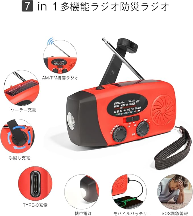 特徴 AMアンテナ内蔵, SOSアラーム, 充電式, 懐中電灯内蔵, 軽量