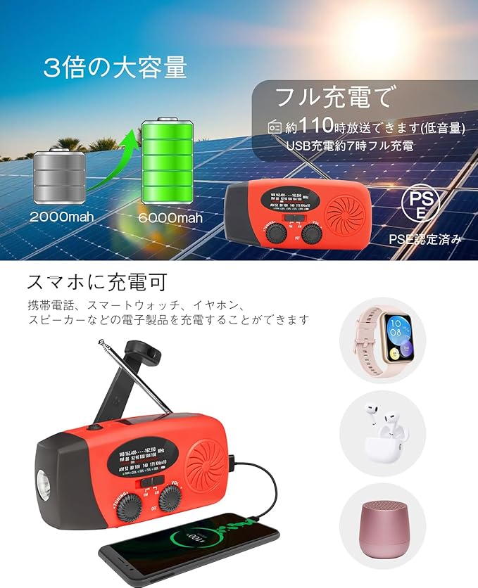 6000mah大容量バッテリー スマホに充電可 この手回し防災ラジオは3.7v6000mahの大電池を使用し、他の防災ラジオと比べて二倍三倍の電力を持っています。フル充電状態:ラジオは約110時間(低い音)、ledライトは60時間(弱い明るさ)使用できます。野外キャンプ、アウトドア徒歩の際にこの多機能ラジオを携帯することで、より多くの楽しみと安心をもたらすことができます。突発的な自然災害による停電が発生した場合、この多機能ソーラー充電式ラジオはあなたの最も安心な防災物品になります。大容量バッテリは携帯電話に充電だけでなく、多くの電子製品に充電にもできます。あなたのアウトドア生活にもっと便利さをもたらします。