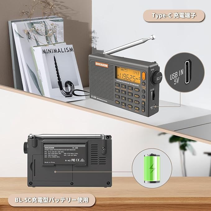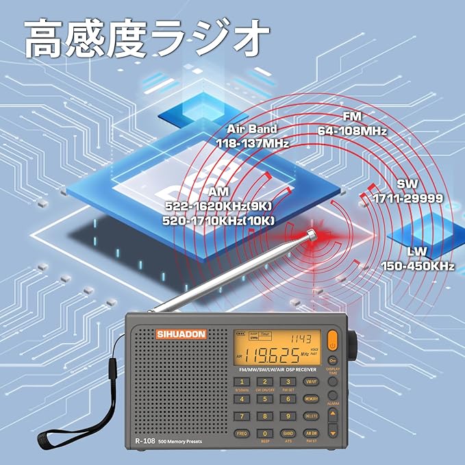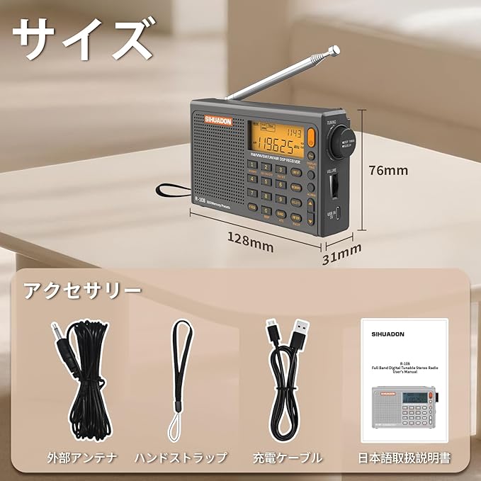 SIHUADON R108 小型短波ラジオ BCLラジオ ポータブル 高感度受信 FM/AM/LW/SW/エアバンド ワイドFM対応 航空無線 USB Type-C充電式 電池式 DSPレシーバー LCD アウトドア 両親への贈り物 | KAZESHOP