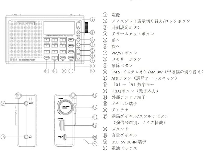 【製品の付属品】 1 x SIHUADON R-108短波ラジオ、1 x USB充電ケーブル、1 x 外付けアンテナ、1 x 説明書、1 x BL-5 C充電電池。