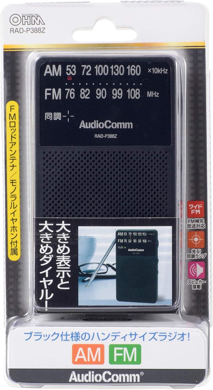 【 特 長 】● ブラック仕様のハンディサイズAM/FMラジオ● 大きめ表示と大きめダイヤル● ワイドFM(FM補完放送)対応● スピーカー搭載● 光る同調ランプ付● FMロッドアンテナ付属● モノラルイヤホン付属