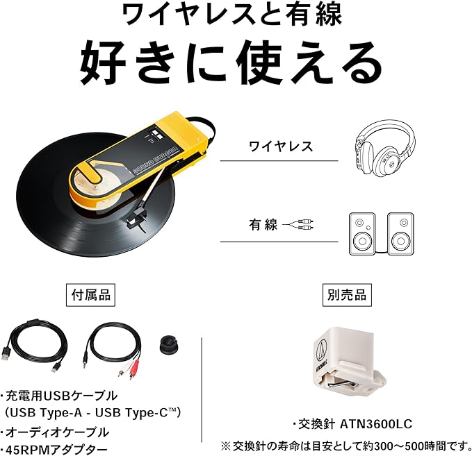 付属コンポーネント 45RPMアダプ ター、オーディオケーブル充電用 USBケーブル USB Type-A - USB Type-C™