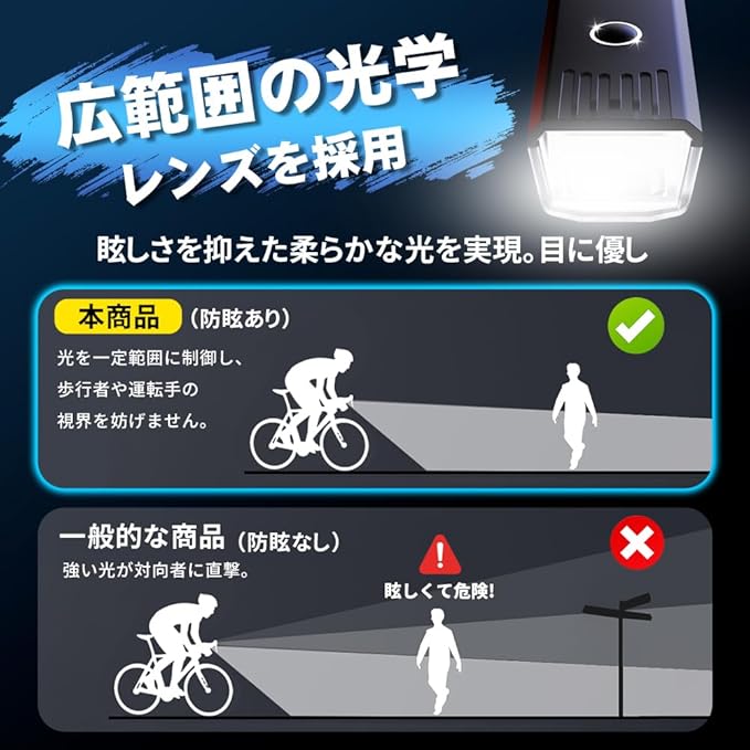【最新型光感应自动调光機能】 搭載高感度光センサーにより、周囲の明るさを自動検知し、ライトの明るさを自動で調整。暗い場所では自動で点灯・明るさアップ、明るい場所では減光または消灯し、電池を効率的に節約します。面倒な手動操作は不要で、夜間走行やロングライドも快適&安心。