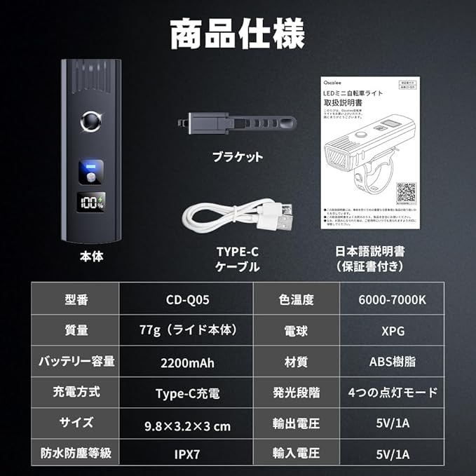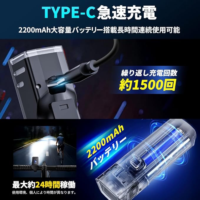【Type-C急速充電&数値表示バッテリーで安心】 Type-Cポート対応により、わずか約3時間でフル充電が完了。最大24時間の連続点灯を実現し、ロングライドやキャンプなどのアウトドアでも安心です。さらに、LED数値ディスプレイを搭載し、バッテリー残量を「%表示」で正確に確認可能。従来の曖昧なインジケーターとは異なり、残量が一目でわかります。約1500回の充電に耐える高耐久バッテリーで、長くお使いいただける信頼の仕様です。