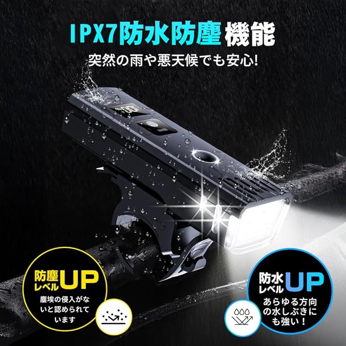 【IPX7防水仕様&工具不要の簡単着脱】 IPX7等級の高性能防水設計で、雨の日や悪天候でも安心して使用可能。防塵性にも優れており、充電ポートもしっかり保護。さらに、工具不要のクイックマウント式ブラケットで、片手で簡単に着脱ができる設計。毎日の通勤やサイクリングでもストレスフリーにご利用いただけます。