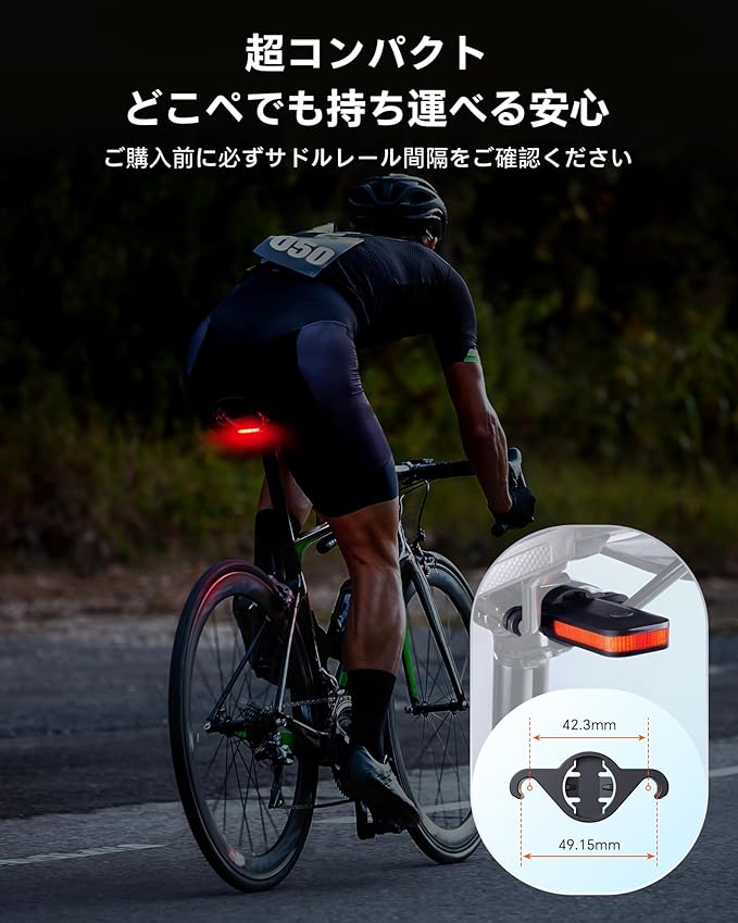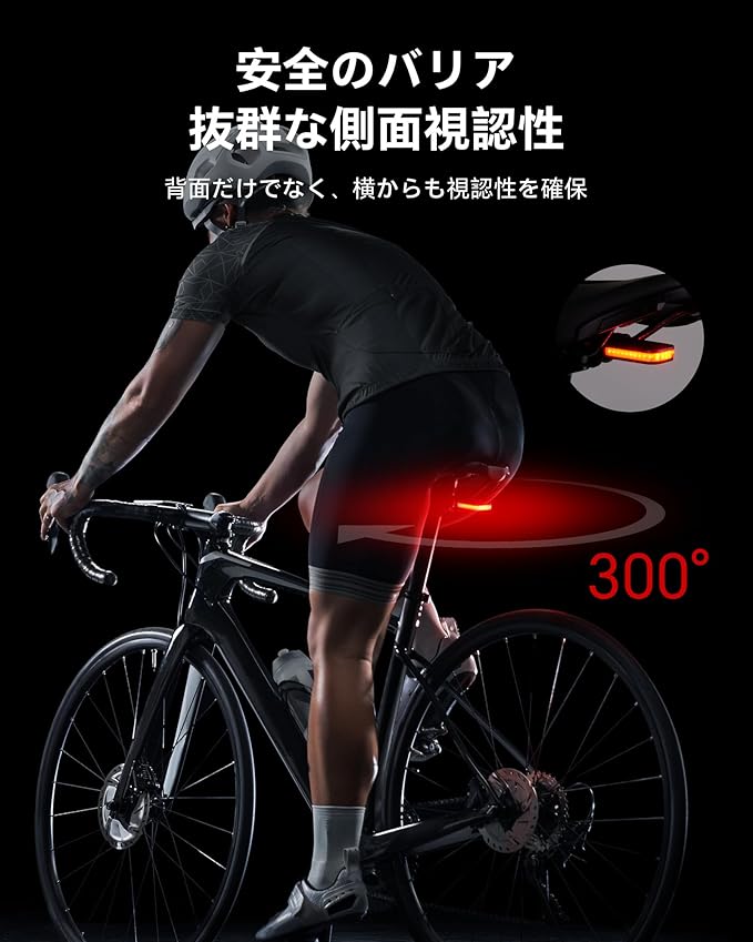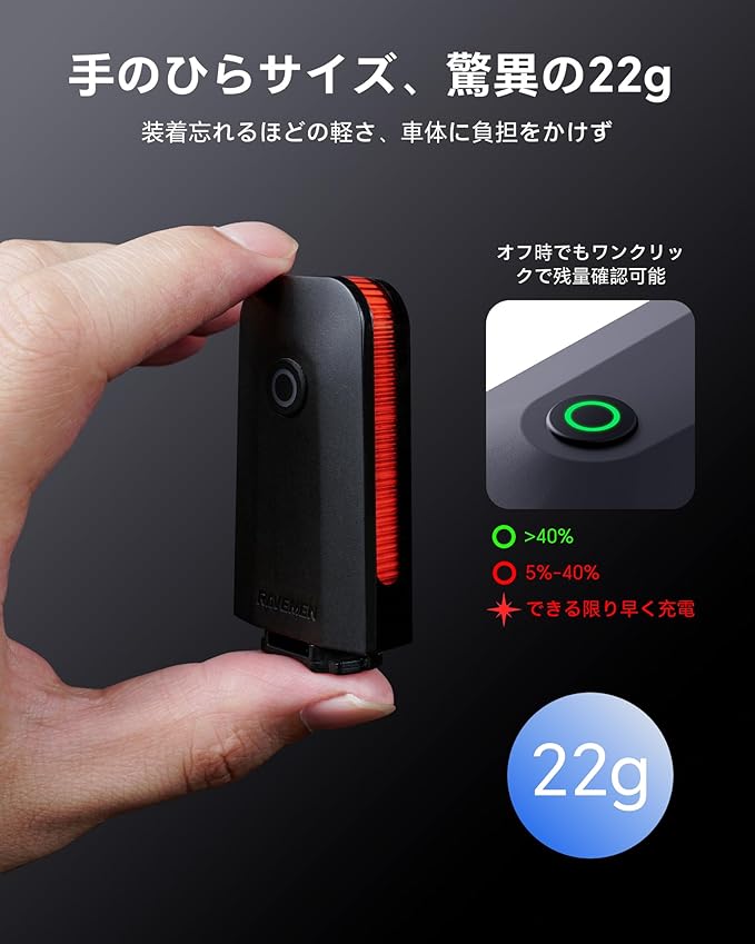 【22g超軽量 & 自動オンオフ】わずか22gの超軽量ボディで、走行中の存在を忘れるほど。振動感知自動点灯と2分停止で自動消灯機能で、電源の入れ忘れ消し忘れを防止。LEDインジケーターで電池残量が一目瞭然。利便性にこだわったスマートな設計です。