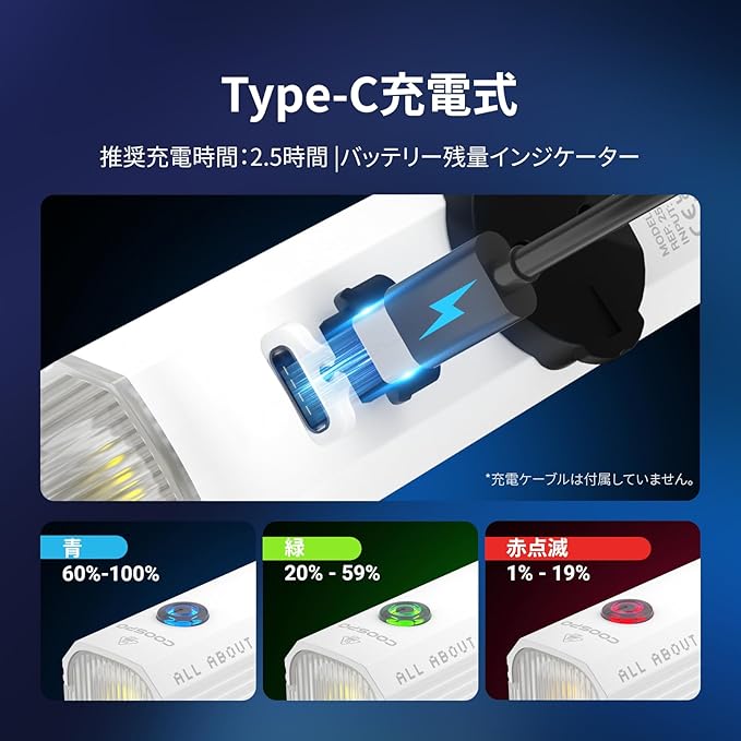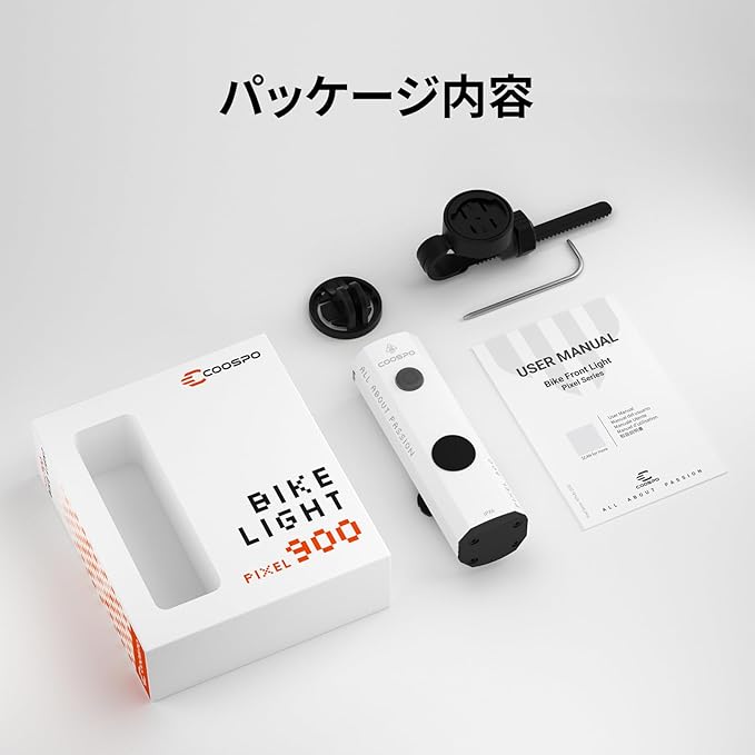 充電式自転車用ヘッドライト:COOSPO PIXELは400 / 600 / 900ルーメンから選べるロードバイク ライトです。TYPE-C充電ポートを搭載しており(充電ケーブルは付属していません)、持ち運びや収納が簡単です。