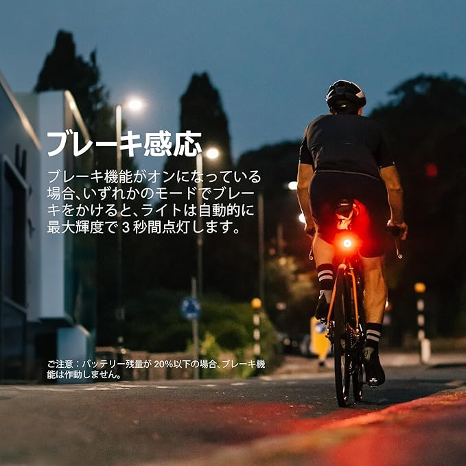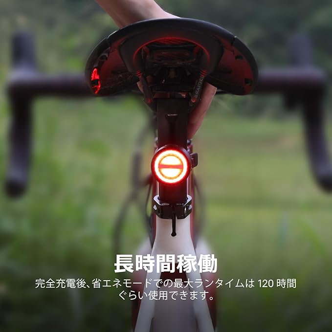 [ブレーキ機能&自動消灯/点灯] ブレーキ機能がオンになっている場合、いずれかのモードでブレーキをかける と、ライトは自動的に最大輝度で3秒間点灯し、後ろの車輌や歩行者を注意させ、夜間のライディングを守 ってくれます。また、モーションセンサーも搭載し、自転車が5分間動かないと、テールライトが自動的に消灯 し、動き続けると、テールライトが自動的に点灯します
