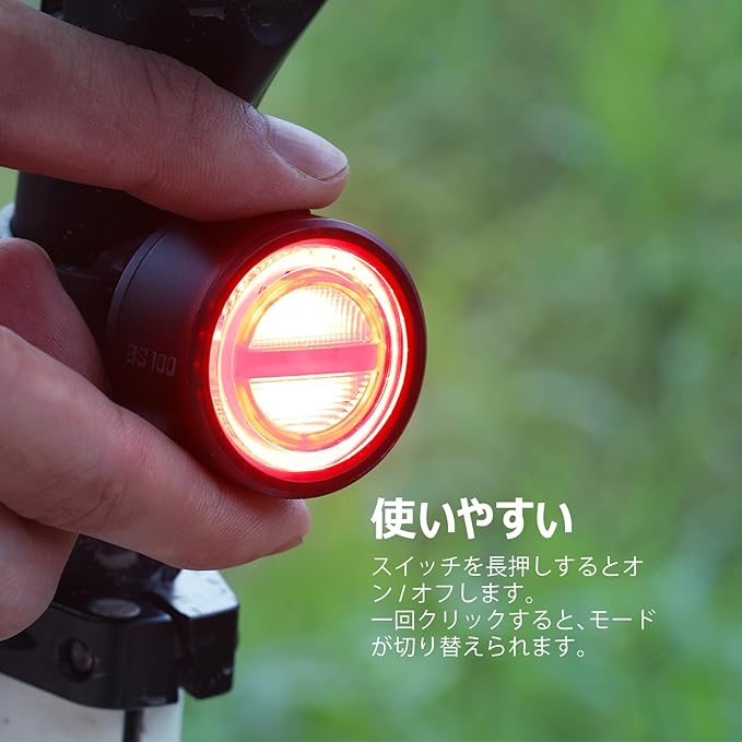 [取り付け簡単&操作便利] 2つの取り付け方法をサポートし、調整可能なシリコンバンドとサドルレールマウ ントより、ツールを使わず、22- 33mmシートチューブ又はサドルの下に簡単に取り付けられます。また、BS100の操作も簡単で、スイッチを長押しするとオン/オフにします。一回クリックすると、点灯モードを切り替えます