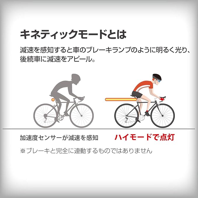 *1時間に約60回キネティックモードが働いた場合の点灯目安時間 ハイ:約1.4時間 ロー:約6時間 点滅:約7時間 ラピッド:約5時間 グループライド:約5時間 デイタイムハイパーフラッシュ:約6時間