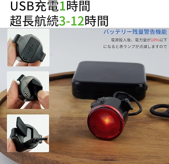【USB フル充電まで約1時間。3~12時間の長時間稼働可能】それぞれのライトはUSBで充電可能で環境に優しい設計です。1時間ほどでフル充電でき、テールライトは3~12時間稼働できます(それぞれ点灯モードにより稼働時間は異なります)。バッテリー通知機能が搭載されており、電源を入れた後にバッテリーが10%以下になると赤いインジゲータランプが点滅し、充電するよう知らせてくれます。