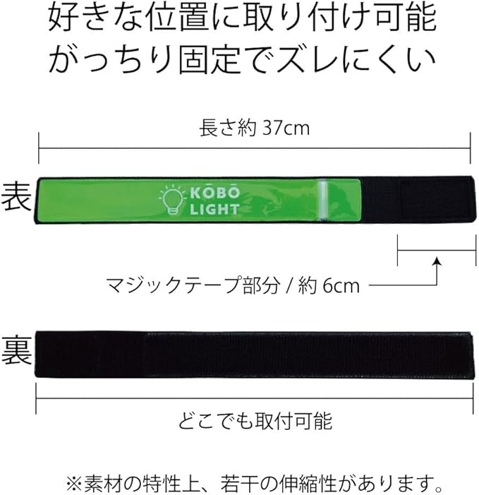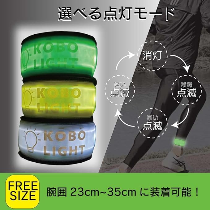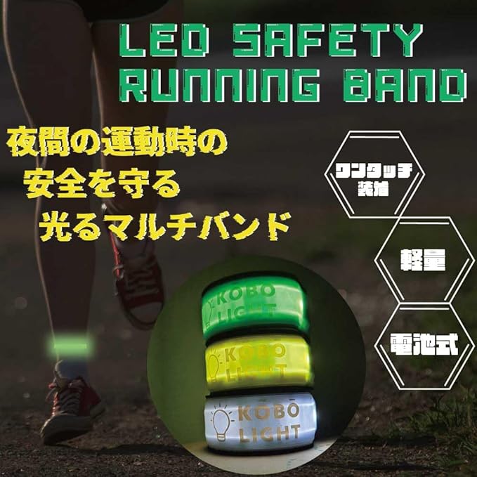 夜間の運動時の安全を守る光るマルチバンド 【選べる点灯モード】 消灯→点灯→早く点灯→遅く点灯 【バッテリー】 電池が付属されていますのですぐにご利用できます。 電池が切れましたら市販のボタン電池で交換可能です。(対応電池:CR2032) 【サイズ】 腕囲23~35cmの間で装着可能。 腕以外にも装着可能です。 【安全性】 反射材+LED搭載で安全性抜群。 超軽量モデルで運動の邪魔になりません。