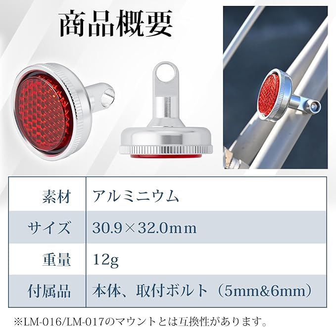 ✅【暗い夜道で存在感】ISO規格準拠設計。●素材:アルミニウム●サイズ:30.9mm(直径)x 32mm(長さ)●重量:12g●附属品:本体、取付ボルト(5mm & 6mm)