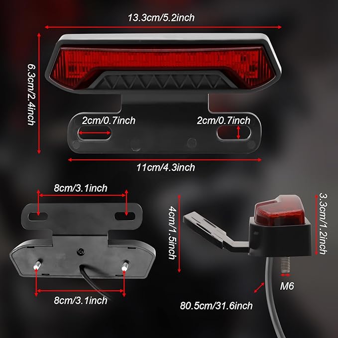 【商品仕様】✦サイズ(約):縦6.5cm横13.3cm奥行3.3cm ✦動作電圧:36V/48V ✦パッケージ内容:E-Bike LEDテールランプ 1 ✦材料:プラスチック+LEDチップ ✦発光色:赤色