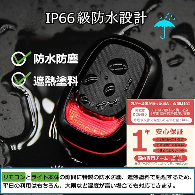【自動車と同品質のCOB高輝度ライト採用&側面に360度ライトリング設計】➊普通のライトより、自動車のバックライトと同品質の光源を採用することで、80~100m超長可視距離を実現しました。例え雨や霧の悪天候でも視認性が高く、後方の注意を喚起し、確実に両方の安全を確保します。➋テールライトA5は180度広角ビームと360度ライトリングの構造を採用して、走行中に後ろだけではなく、左右からの衝突も効果的に回避でき、側面の視認性を実現しました。特殊な設計で光は非常に透明で、普通のライトより肉眼に傷をつけなく、 道路上の歩行者に迷惑をかけることを心配する必要はありません。