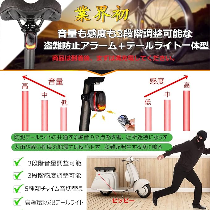 【防犯テールライト】感度や音量は3段階から自由に調整可能となりますので、市販上の防犯テールライトの共通する爆音という欠点を改善し、近所迷惑にならない同時に、大雨や軽い程度の地震では反応せず、盗難が発生する際に鳴ることができます。【知能的な盗難アラーム&テールライト兼用】単なるテールライトだけではなく、バイクや自転車のセキュリティアラームとしても使いやすいです。生産工場は8000回の感度実験を行い、特定な感度を設置完了したため、万が一盗難が発生する時、テールライトは高速フレッシュするとともに、十分な105~120dbの音が鳴り、アラームしてくれますので、泥棒・侵入者に効果的に撃退できます。(別途で盗難アラームを購入する必要が無し)