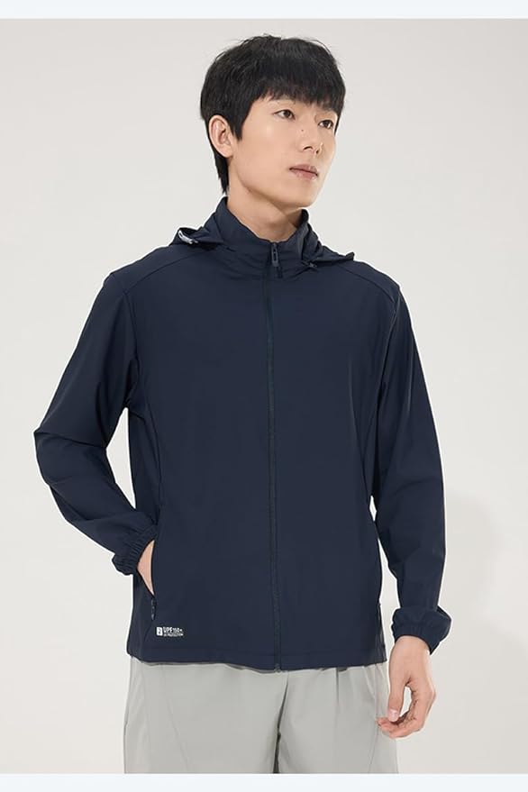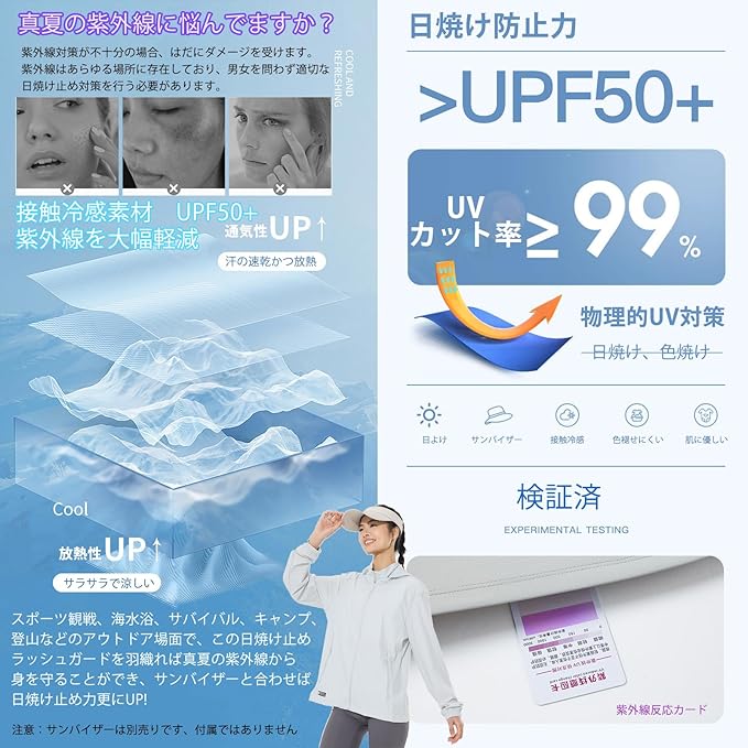 【デザイン特徴】立ち襟のフード付きで、しっかりと頭をカバーしてくれます。夏の紫外線対策にはバッチリ。両側にジファスナーポケットが付きで、小物をしっかりと安全に収納出来ます!袖口には程よくフィットするゴム仕様、伸縮性が抜群で日よけ対策にバッチリ!極薄でスパンデックス素材を採用することで、ストレッチ性抜群、超軽量、冷感通気性や速乾性に優れたナイロンパーカーに仕上げました。
