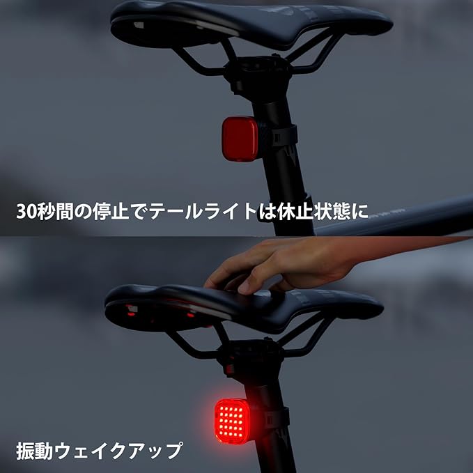【振動センサーによる自動ウェイクアップ】- CYCLAMI自転車用テールライトは、30秒間操作がないと自動的にスリープモードになり、30分後に自動でシャットダウンしてバッテリーを節約します。軽い振動でライトが瞬時に起動し、最後に使用したモードを再開します。設定をリセットする必要はありません。頻繁に自転車に乗る方に最適なこのスマート機能により、操作が簡単でバッテリー寿命が延びます。