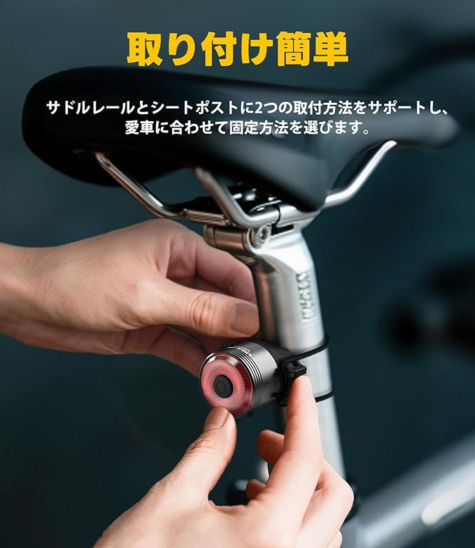 【IPX6防水&取り付け簡単】弊社のUT100 自転車 テールライトは高密閉性のプラスチック製を採用しており、雨水等が本体に入るのを効果的に防ぎます。雨の日も大活躍。軽くて、防振性も抜群。サドルの下のシートレール、またはシートポストどちらにも取り付けられます。他の工具なしで、付属するゴムバンドで簡単的にテールライトが取り付けることができます。
