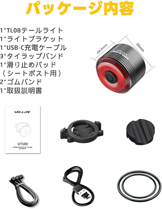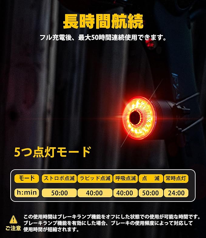 【ブレーキランプがオン/オフ可能】:UT100自転車リアライトはブレーキランプがマニュアルでオン/オフできます。電源オン状態でスイッチを3秒間長押しすると、ランプが3回点滅し、ブレーキ機能がオフになります。ブレーキ機能をオンにする必要が場合、電源オン状態で再度スイッチを3秒間長押し続けると、ランプが3回点滅し、ブレーキ機能が再開します。自分の好みで使用でき、とても便利です。