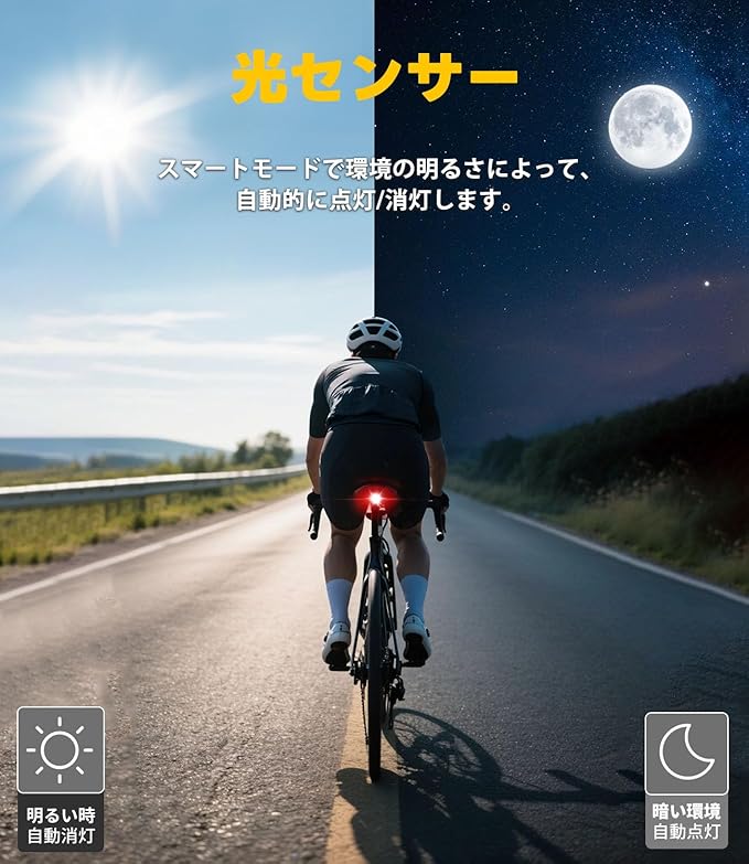 【USB-C充電式&電量確認可&自動点滅】乾電池不要の400mAh内臓電池でUSB-Cで繰り返し充電可能、とっても便利です。4個の赤いバッテリ状況ランプがあり、電源を入れる時にバッテリ残量を直観的に表示します。また、スマートチップを搭載し、スマートモードで120秒後振動感知がないと、自働的に消灯し、振働を感知するとすぐにロードバイクテールライトが点灯します。