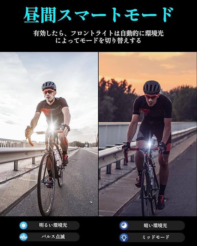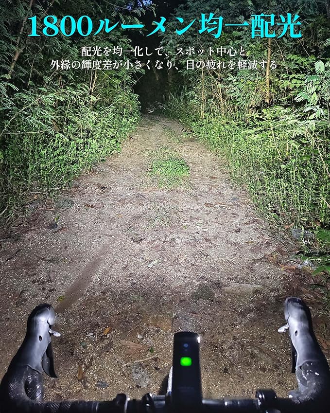 【7つ調光モード・側面視認性】K1800ロードバイクライトは高品質なLEDを採用して、ハイ(1800ルーメン1.5時間)、ミッド(1000ルーメン3時間)、ロー(500ルーメン5時間)、節電(250ルーメン8時間)、パルス点滅( 500ルーメン25時間)、昼間走行(500/1000ルーメン)、AI夜間走行(250-1800ルーメン)合計7つの調光モードがあります。そして、モード記憶機能もあります。再度オンにしたときに最後に使用されたモードを自動設定しています。最大1800ルーメンの明るさで作動し、超広角レンズが搭載され、側面の視認性も実現し、走行の安全も確保できます。