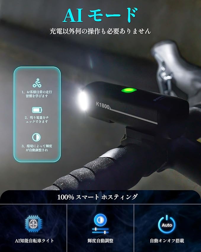 RAVEMEN K1800 自転車 ライト 自転車ヘッドライト ロードバイクライト 1800ルーメン AI夜間走行モード 自動オンオフ【 光センサー&振動センサー搭載】USB-C充電式 昼間走行モード 高輝度 IPX7防水 側面視認性 電量チェック モード記憶 4つ調光モード PSE認証済 懐中電灯兼用 通勤通学 防災 AUB01吊り下け部品付き メーカー直営 日本語説明書付き(ブラック) | KAZESHOP