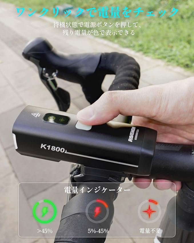 【USB-C充電/放電・電量チェック】K1800自転車ライトはUSB-C充電を採用し、充電しながら点灯できて便利です(満充電:約3.5時間)。放電機能も搭載して、モバイルバッテリとして使えます。スタンバイ状態で、ワンタッチで電池残量を表示でき、突然の電力不足の心配はありません。(緑色点灯:45%-100%;赤色点灯:5%-45%;赤色点滅:5%以下)