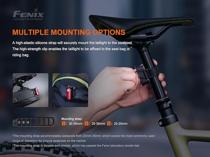 【多用途な取り付けオプション】Fenix BC05R V2.0は、付属の高弾性ラダーストラップを使用してシートポスト(直径20~35mm)に簡単に取り付けることができます。付属のボディクリップアクセサリーで安全マーカーライトとして使用し、適応性のある使用法を提供します。