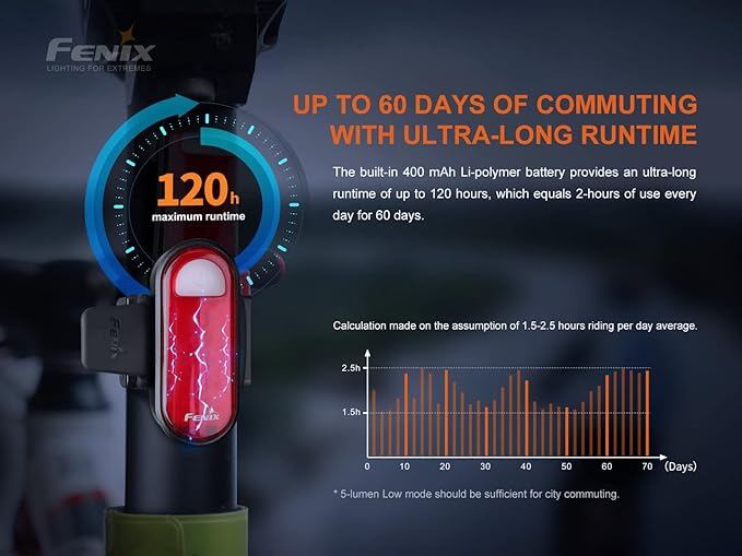 【長持ちするパフォーマンス】6つの出力レベルと400mAhリチウムポリマーバッテリー内蔵。 1回の充電で最大120時間のランタイムをお楽しみいただけます。毎日の通勤や長時間のライドにも対応できます。