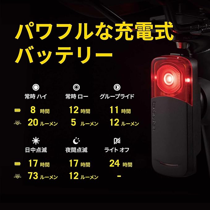 ✔【自転車テールライト】 ブライトン ガーディア R300Lは、明るい73ルーメンのバイクテールランプを搭載しています。昼間でもはっきり見えます。このランプには、クリー社製のCREE_XPEBRD-L1 LEDチップが採用されており、明るさと信頼性が確保されています。5つの点滅パターンをサポートしており、これらは直接選択するか、サイコンから選択できます。さらに、車両が検知されるとライトが自動的に点滅し、運転手にバイクの存在を警告します。ライダーと運転手の両方に知らせることで、安全性が倍増します。また、ガーディアの内蔵加速度センサーにより、ブレーキランプの機能も実装されています。後続車両および一緒に乗っている友人に減速の合図をすることで、追突事故を防ぐ効果があります。
