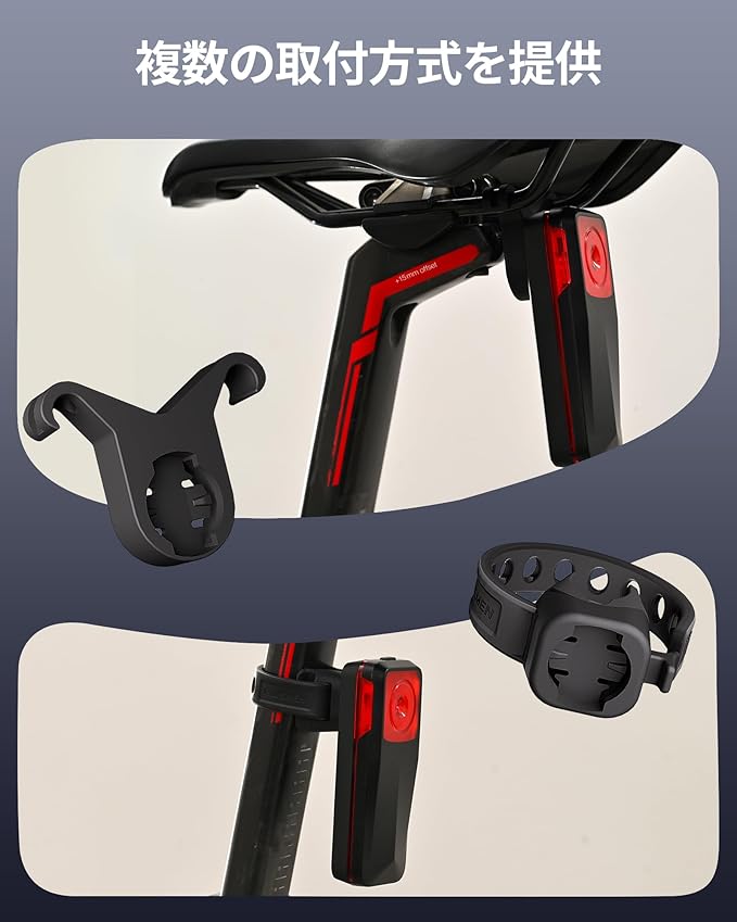 【多様な取り付け&完全防水】丸型/エアロシートポスト(最大径4.5cm)やサドルレールに簡単取り付け可能。IPX6防水仕様で雨の日も安心です。(※ご使用前には充電ポートカバーを確実に閉めてください)