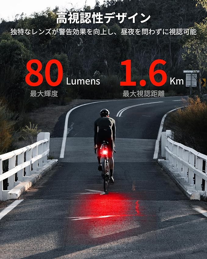 【高輝度80ルーメン・広視認性】最大1.6km先から視認可能な高輝度テールライト。広い照射角度で昼夜問わず存在感をアピール。悪天候時や視界不良時にも効果的です。